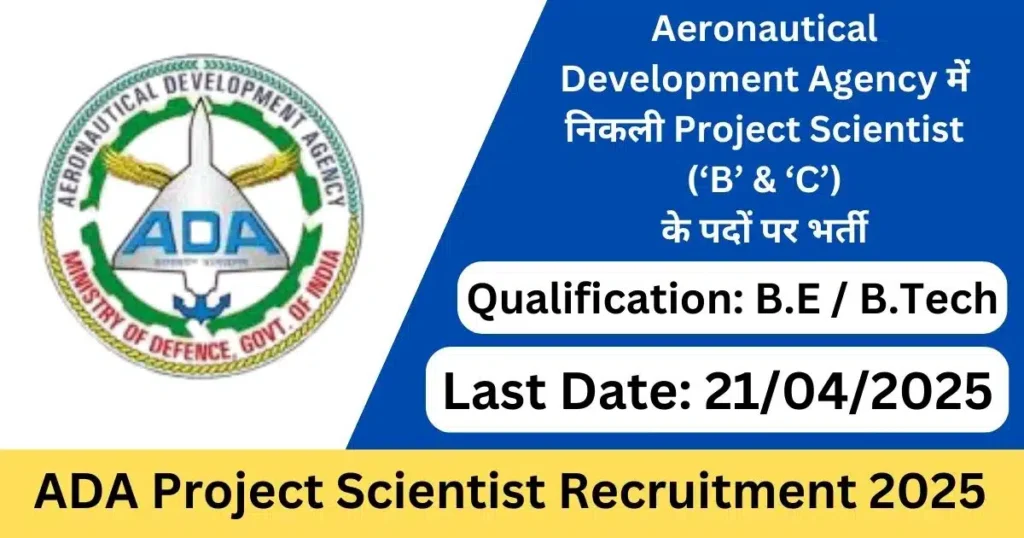 Aeronautical Development Agency (ADA)Project Scientist (‘B’ & ‘C’) Recruitment 2025Advt No. : ADV-130 Short Details Of Notification |