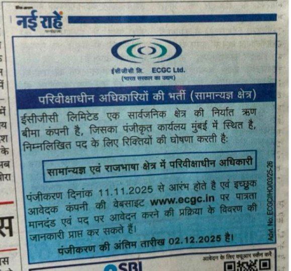 About Post : Export Credit Guarantee Corporation of India Ltd. (ECGC Ltd.) has released a short notice for the ECGC Probationary Officer (PO) Recruitment 2025. ECGC Ltd, has announced vacancies for the post of Probationary Officer in the General and Rajbhasha streams. Interested and eligible candidates can apply online from 11th November 2025 onwards. The ECGC PO Recruitmentregistration window will remain open until 2nd December 2025. The detailed notification containing eligibility criteria, vacancy details, and the online application process will be available soon on the official ECGC website, www.ecgc.in. Aspirants are advised to regularly check the official website for the latest updates and the official notification PDF