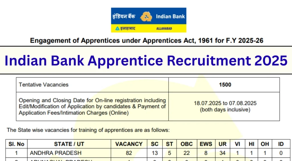 About Post : Indian Bank has released the job notification regarding filling of Apprentice Job Vacancies. The Government organization invites Online application from eligible candidates have required qualifications. These 1500 Apprentice Posts are Across India. The eligible candidates can apply for the post through Online from 18.07.2025 to 07.08.2025.