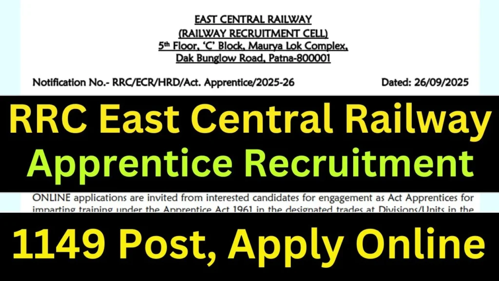 About Post : Railway Recruitment Cell (ECR East Central Railway) RRC ECR Apprentice Recruitment 2025, Eligibility, Fee, Last Date, Apply Online, RRC ECR Patna has released the New Notification for the recruitment of ECR East Central Railway Apprentice New Vacancy 2025 for 1149 Posts, RRC ECR Apprentice Online Registration Form 2025 has started from 26 September 2025 to 25 October 2025. through the official website of the Railway. The candidates who are interested for RRC ECR Apprentice Bharti 2025, Kindly read the full notification related to ECR East Central Railway Apprentice Jobs 2025 Like Application Fee, Age Limit, Salary, Selection Process and all other information, All the details related to Railway Apprentices Online Registration Application Form 2025 Link is given below.