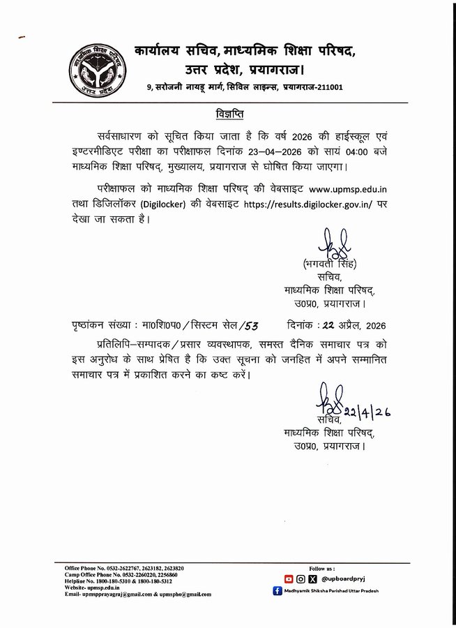 About Post : The Uttar Pradesh Madhyamik Shiksha Parishad (UPMSP) has released the UP Board Result 2026 on 23 April 2026 for both 10th and 12th classes. The direct link to check the UP Board 10th Result 2026 and UP Board 12th Result 2026 is provided here. The students can also visit the websites upmsp.edu.in, results.upmsp.edu.in, and results.digilocker.gov.in to check the UP Board Result 2026.